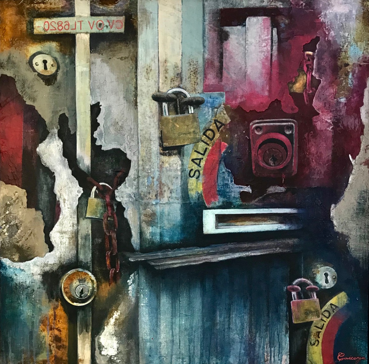 Lock it up mixed media on canvas 100cm x 100cm 2019